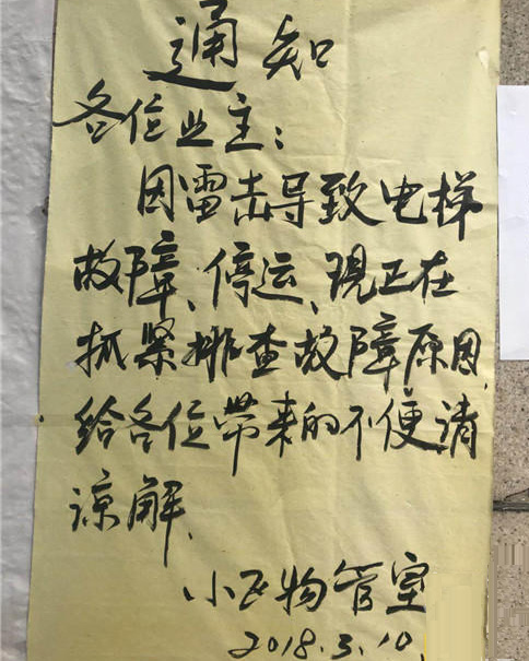 最近,家住咸陽一小區(qū)的很多住戶遇到了麻煩,他們的生活特別不方便,因為小區(qū)的電梯罷工已經(jīng)幾天了,這是咋回事呢? 原來事發(fā)的小區(qū)只有一棟樓,分為三個單元,每個單元只有一部電梯,而電梯突然癱瘓的原因,竟與一聲驚雷有關(guān)!